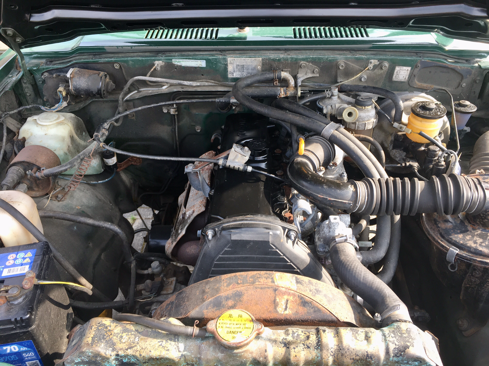 was ich noch nicht erwähnt hatte war, daß der Motor aus einem Hiace (2L-T ?) stammt, weswegen ich von außen keine optische Übereinstimmung zum Hilux/2LII finden konnte, siehe Bild oben. Der Ventildeckel ist anders, Form, Position des Öleinfüllstutzens...