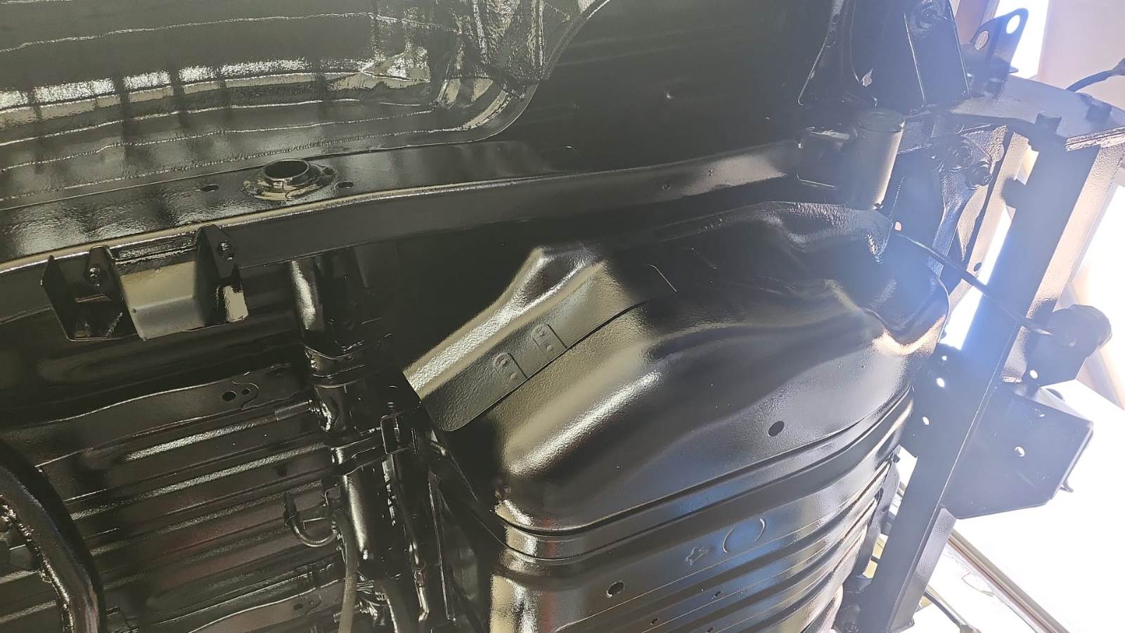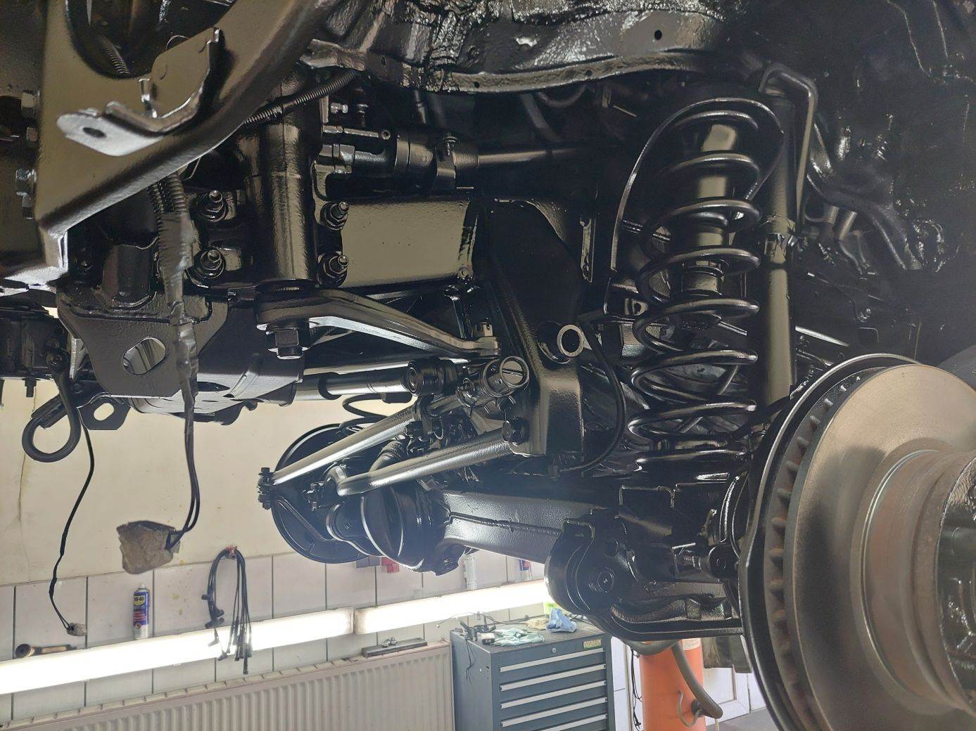 nun sind 4 Schichten (Rostschutz-) Farbe druff und 2 Schichten heißes Fett.... so sieht das dann aus...mein lieber Mann, was für eine Arbeit! Das Mehrgewicht wollte ich eigentlich mit Hilfe der Parabelfedern wieder einsparen... Scherz!