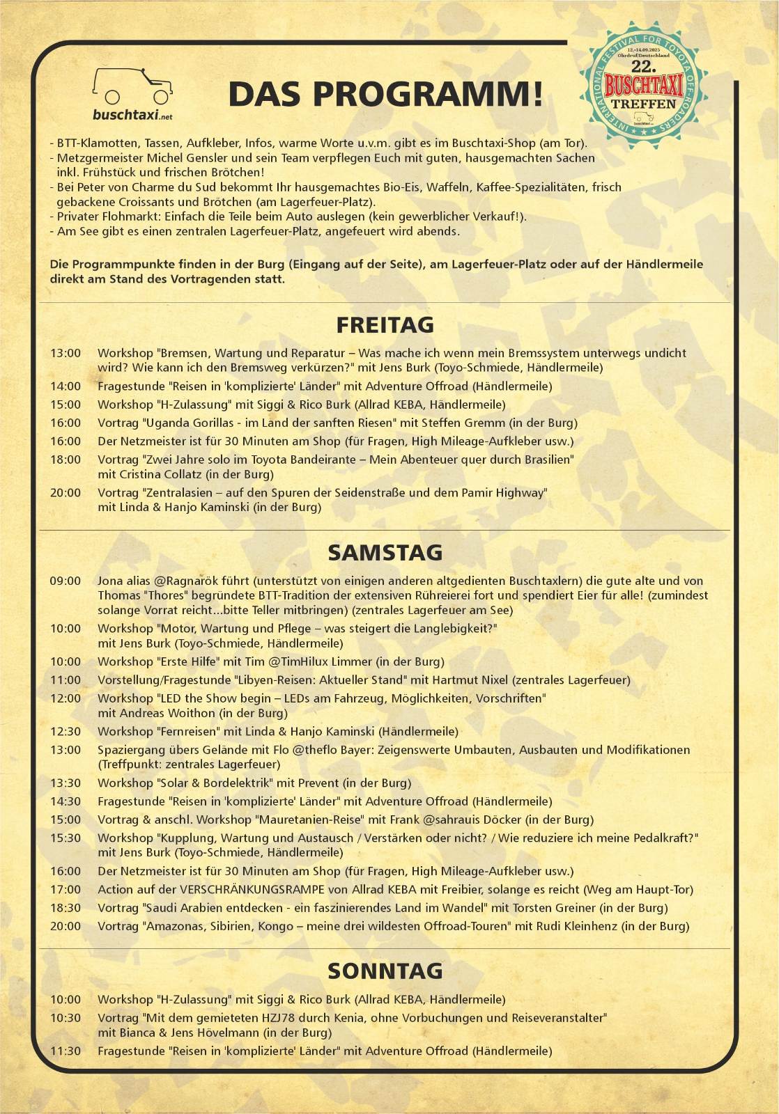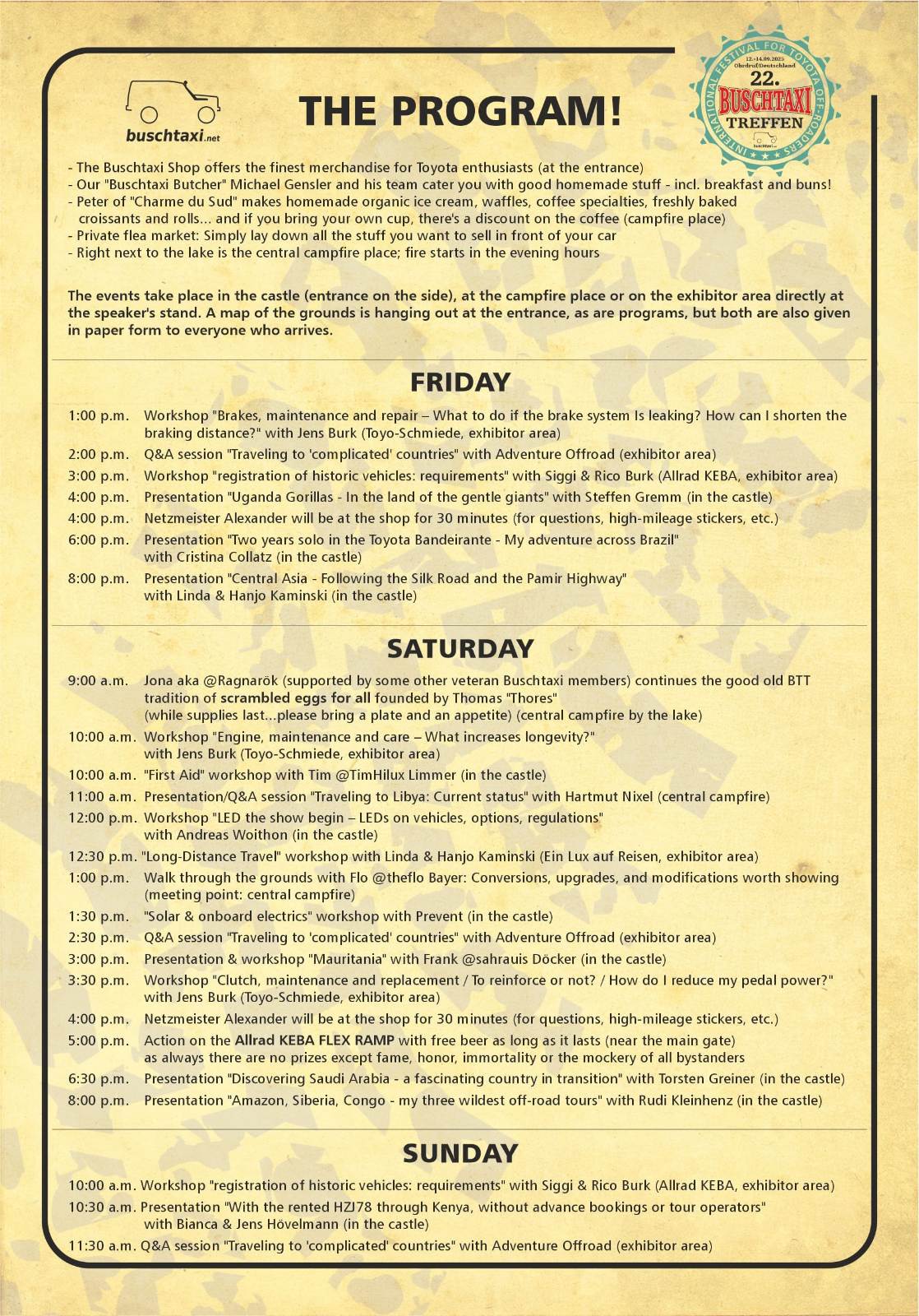 10:30 Vortrag "Mit dem gemieteten HZJ78 durch Kenia, ohne Vorbuchungen und Reiseveranstalter" mit Bianca & Jens Hövelmann (in der Burg)