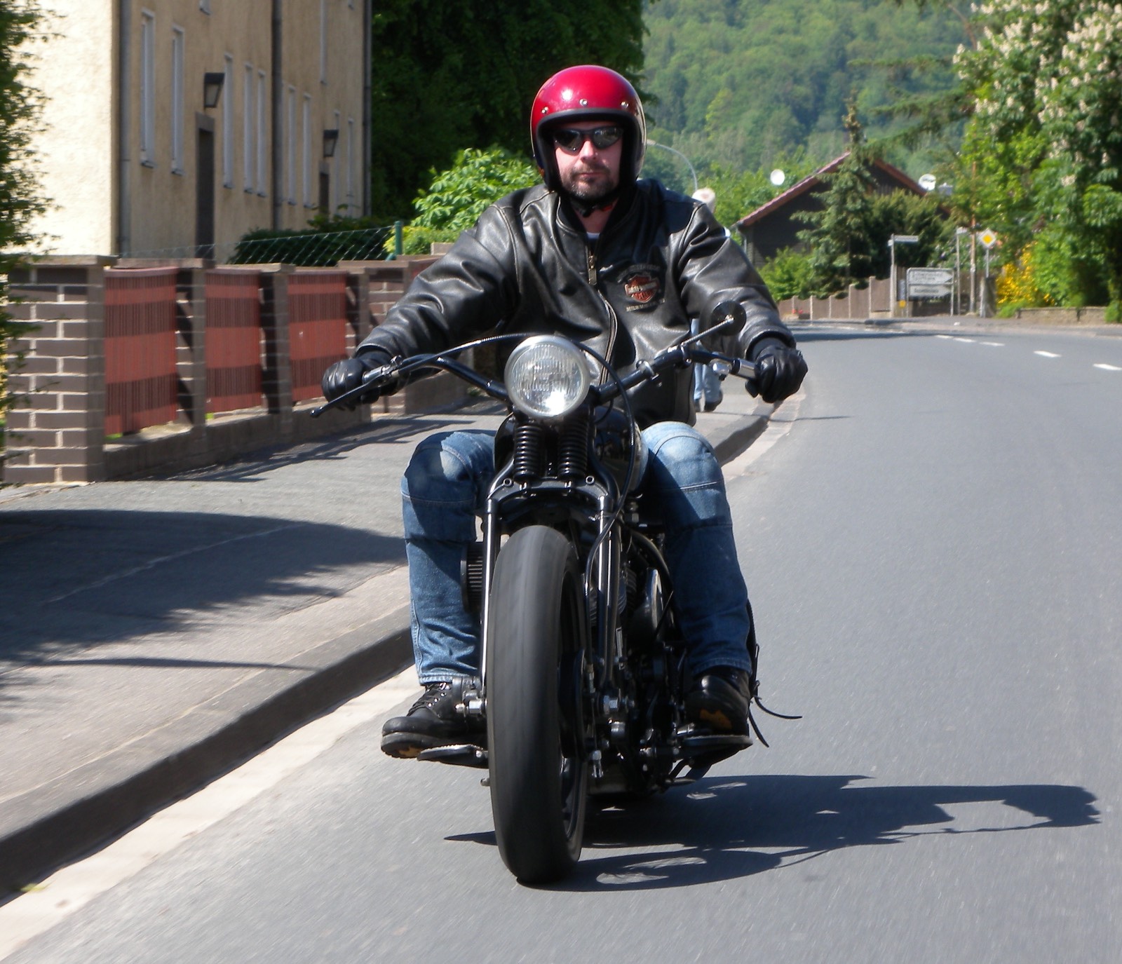 Hab' seinerzeit sein erstes kommerzielles Bike gekauft, aufgelegt in einer Serie von 5, als Replika einer Harley aus dem Film "Wilde Orchidee". Wurde dann anlässlich der Planung seines 20 jährigen (glaub' ich) Firmenjubiläums angerufen, ob ich das noch hätte. Man wolle alle Bikes von ihm als Ausstellung präsentieren, die anderen 4 wären verschollen oder nicht mehr im Originalzustand. Ich, ja, hab' ich noch, aber hat Riß im Heckfender (ein Problem, weil der halbe Sitz drauf ruht). Man bat mich sehr eindringlich, das zu fixen und vorbeizukommen. Ich also gefixt und am Tag der Feier 150km bei beschissenstem Wetter hingefahren. Basis ist ne Softtail, aber mit Dämpfern so "unsoft" gemacht, daß 150km (und die 150km zurück) schon grenzwertig sind.