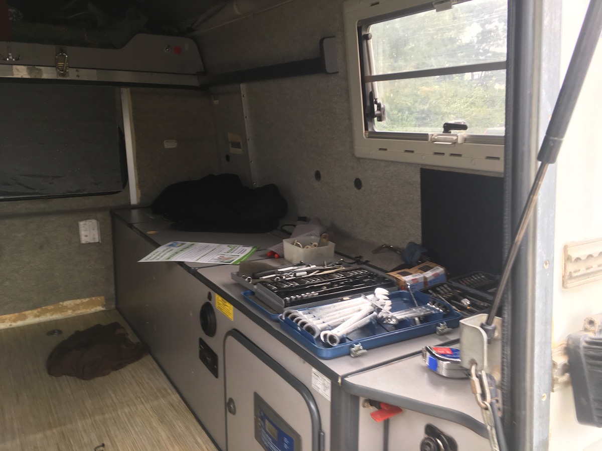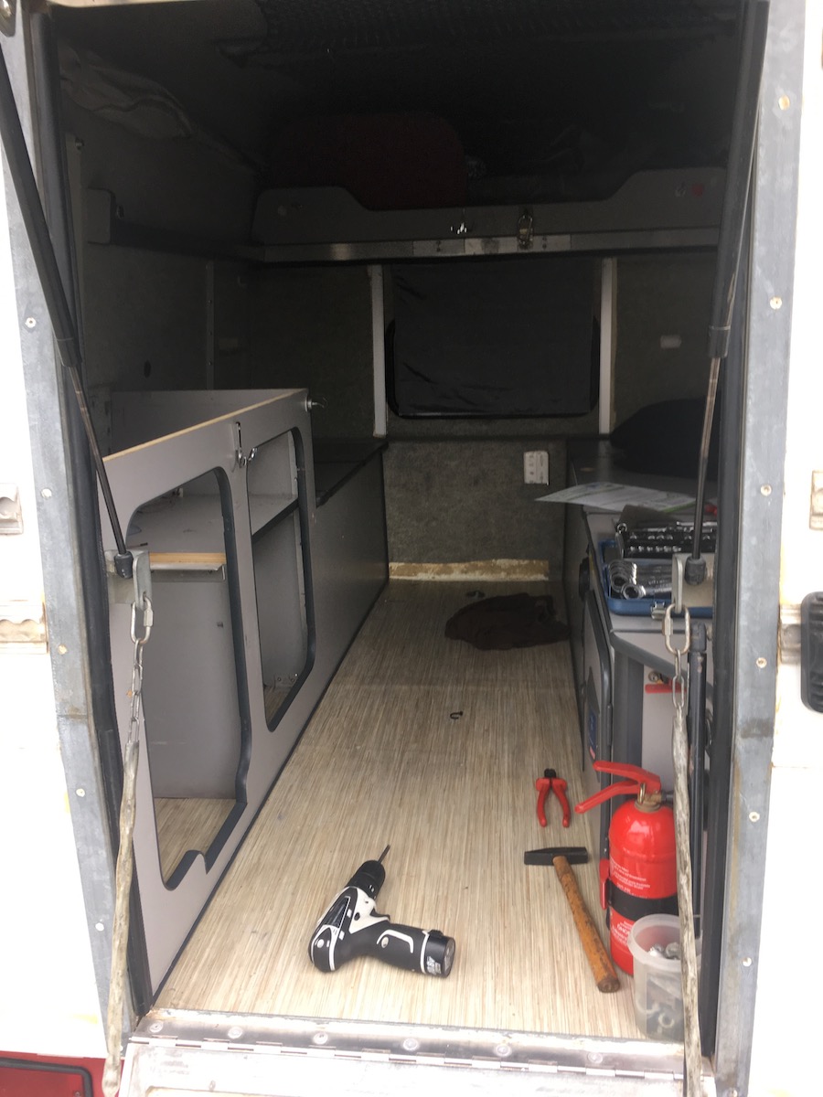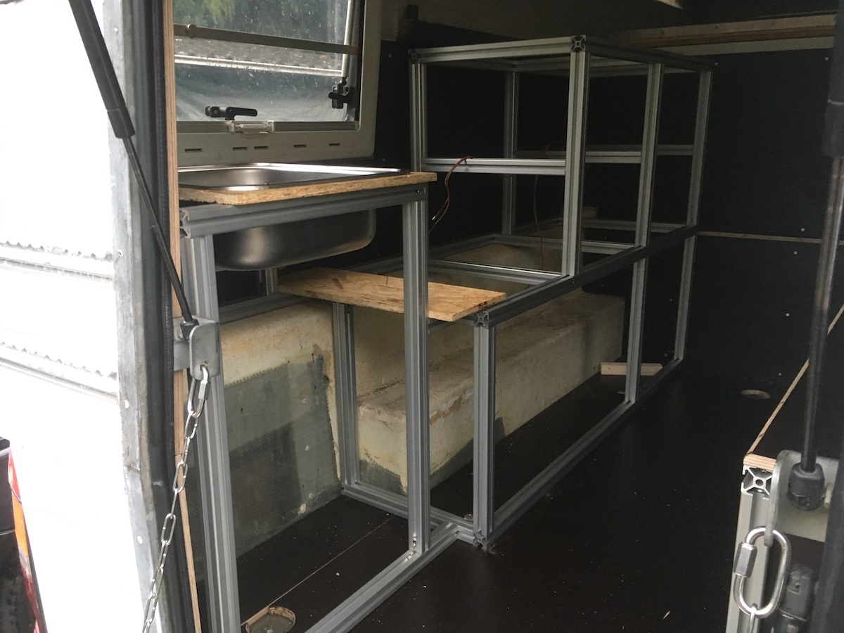 und weiter auf der linken Seite mit dem Innenausbau. Stauraum, Wasch und Kochecke.
