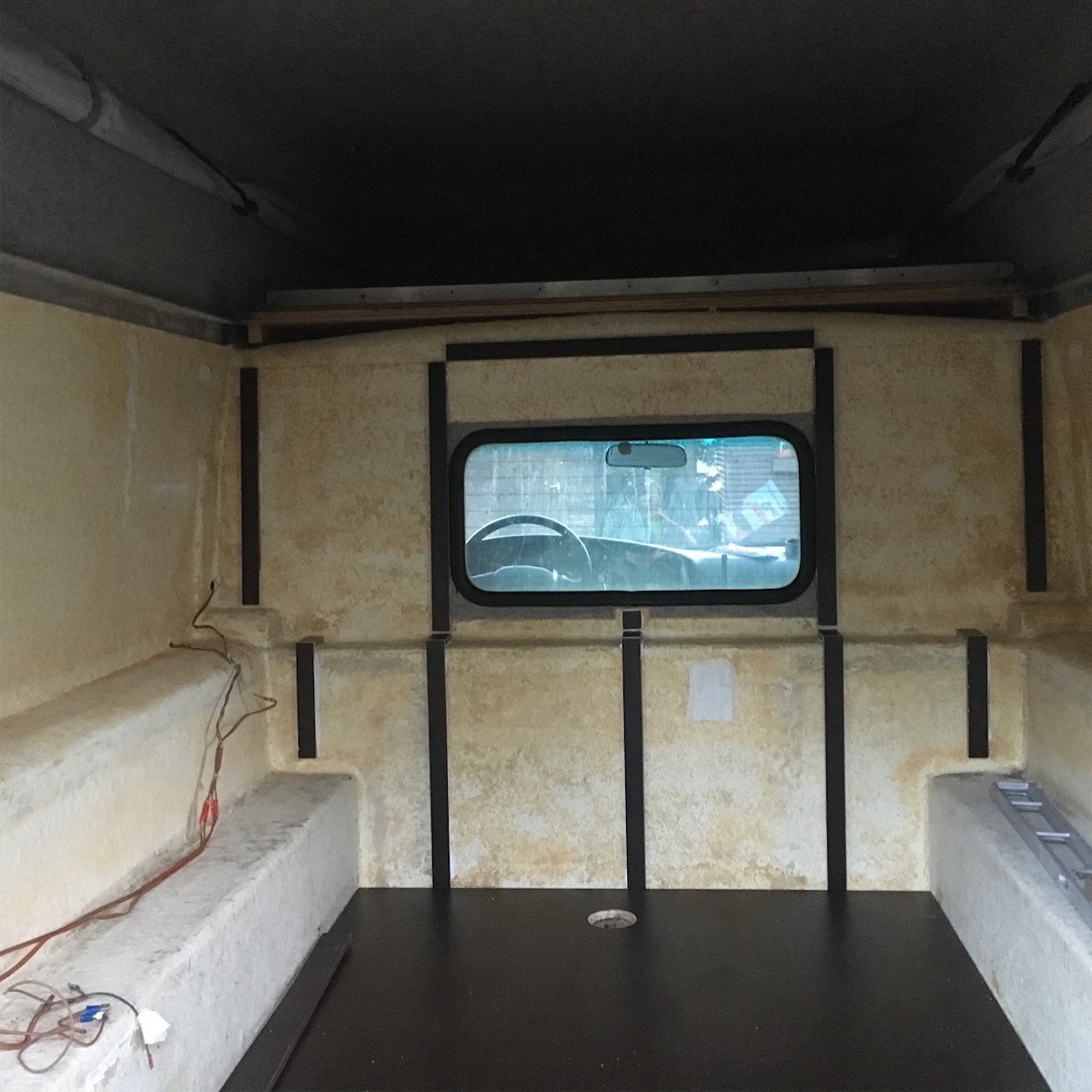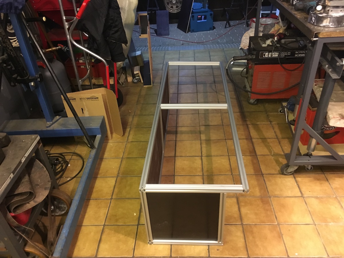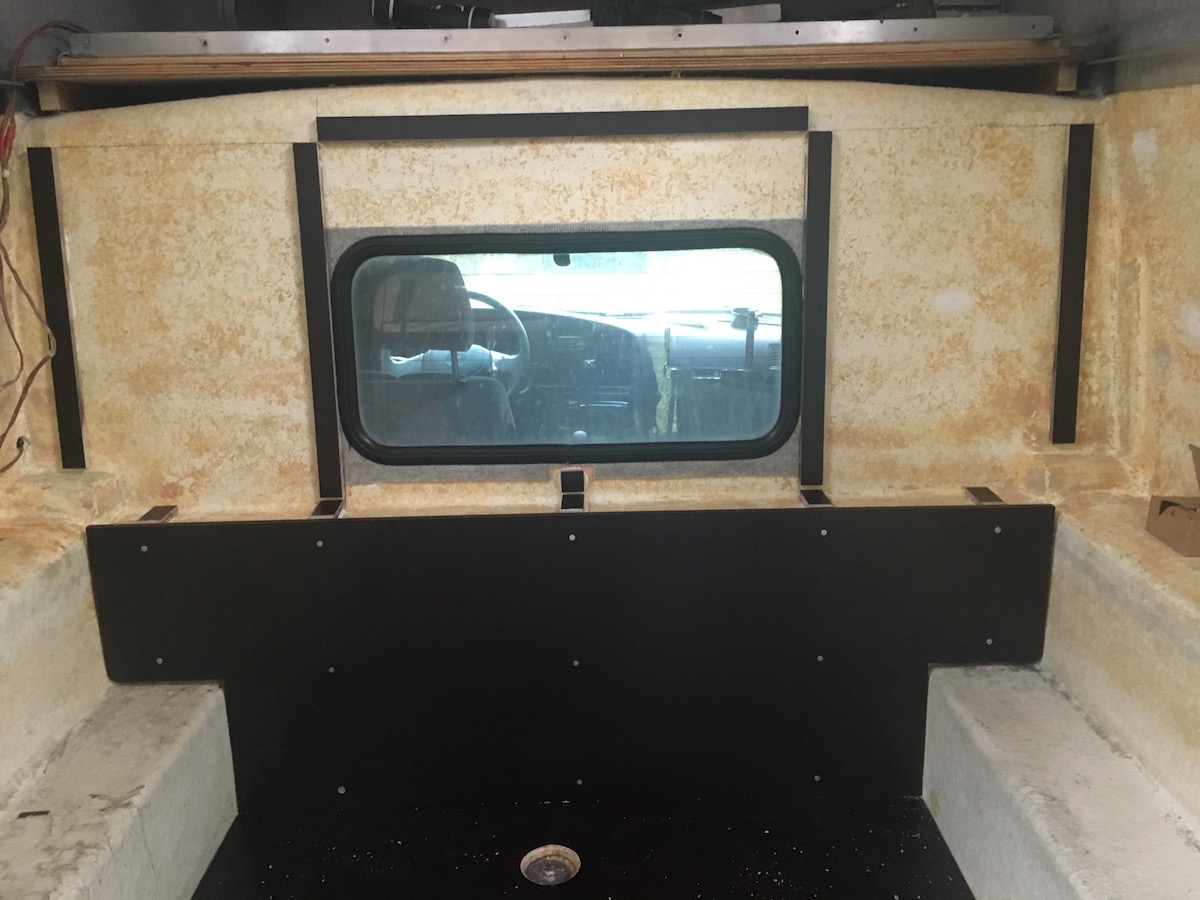 Siebdruckplatte 12mm als Boden rein und Siebdruckleisten an die Wand geklebt damit ich nicht in die Kabine schrauben muss.