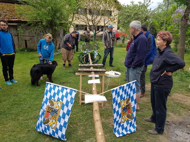 Mithelfen ist erwünscht, Baum schlagen, holen im Wald, bewachen (wenn wir uns das zu trauen), Kranz binden, Schilder befestigen. Das Treffen dauert bis Sonntag 3. Mai. Wir müssen den neuen Maibaum ja ordentlich begiessen.... :wink: