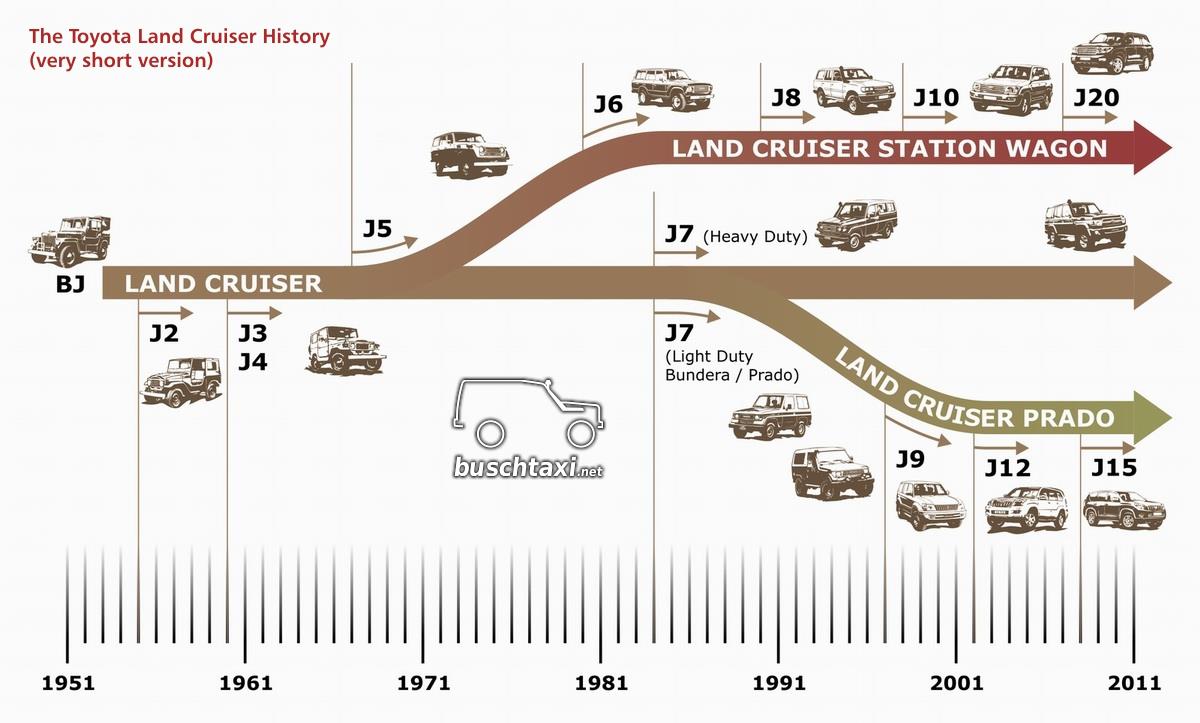 Parallel gibt es also drei Baureihen: Land Cruiser (J7 bzw. 70 Series), Land Cruiser Prado (J15 bzw. 150 Series), Land Cruiser Station Wagon (J20 bzw. 200 Series).