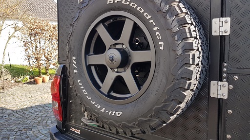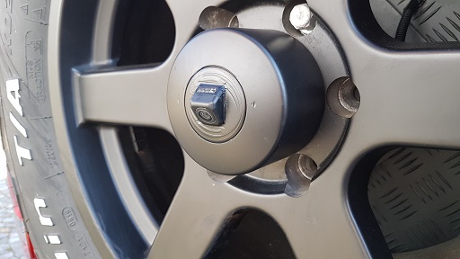 Serienkamera in die Nabenkappe vom Ersatzrad eingebaut, natürlich mit Stecker. Kann man schnell abziehen um das Rad zu benutzen...